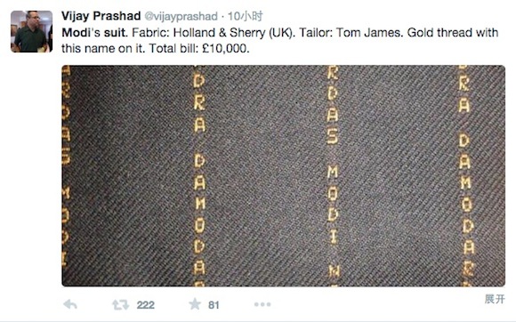 “莫迪的套装,布料:Holland & Sherry(英国)。制作: Tom James。金线绣字。价值10,000英镑。”