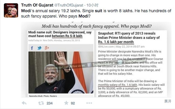 “莫迪的年薪192万卢比,一身套装80万卢比。他有上百件这样的服装,谁为他买单?”