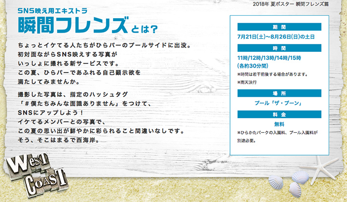 上图就是服务详情了,7月21日至8月26日期间,每日11点至15点,每小时一次,每次30分钟,在最适合拍夏日写真的泳池附近,“瞬间朋友们”在此免费恭候游客,即便下雨也不离不弃。同时,园方也希望游客在社交网络上发照片时,加上标签“#我们是不认识的”,表示即便如此,也能在公园里享受美好时光。
