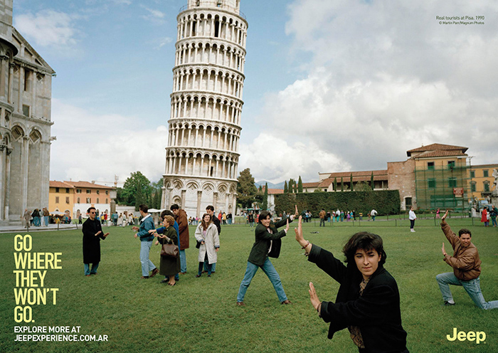这一次,我们看到这些经典照片,是被用作汽车广告。照片里,在意大利的比萨斜塔、希腊的神庙遗址、日本的人造海滩,处处人头涌动,而游客们还在努力拍摄旅游纪念照。广告词“Go Where They Won’t Go“则希望借照片叫人们买越野车自驾游,去看不一样的风景,摆脱千篇一律的游客照。