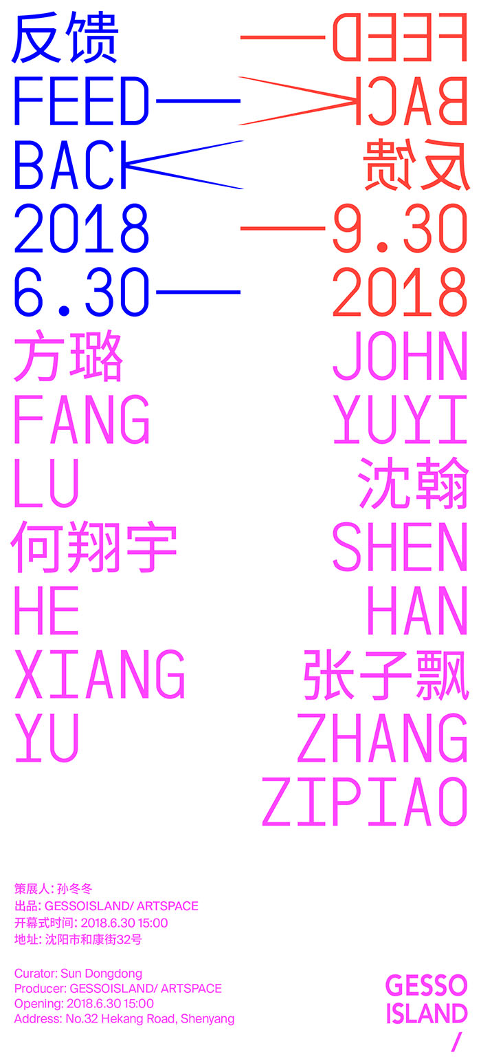 反馈(feedback),是控制论的一个基本概念,用于描述系统与环境之间相互作用的动态过程,在此引作展题,旨在提示后全球化时代条件下,我们身居其间的一种日常化的回路现象,一方面它体现在生活方式层面,另一方面它也显露在意识形态层面,两方面都涉及到全球化与在地性之间的现代性思辨之议题——相较于屈折迂回的历史化叙述,作为展览的“反馈”,凸显的是具有生命感的艺术家个体,跨越既定身份与现实界域,自我开放之后所感受到的世界普遍性,以及对主体性的重新确认。同时,展览作为一种现实性的反馈机制,也在表明展览所在机构“GESSOISLAND/”的文化愿景,即通过向世界的开放,以此逾越沈阳城市标签化的文化氛围,在地寻求更多新的可能性。