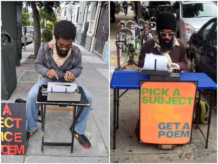 “我在旧金山写诗写了5年,”Gentry说,“最近我在国内旅行,在来纽约之前,我去过西雅图、波特兰、里诺、盐湖城、夏延、柯林斯堡、奥马哈市、得梅因、拉斐特和芝加哥,旅费都是靠路上给别人写诗挣来的。”