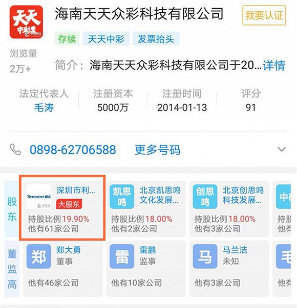 根据工商信息资料显示,这些违规投注平台背后都是由腾讯、网易、猎豹等公司深度参与。以“天天中彩票”为例,其运营方为海南天天众彩有限公司,最大股东为深圳市利通产业投资基金有限公司,而这家公司的执行董事正是腾讯互娱的掌门人任宇昕。在2014年,天天众彩还获得了腾讯产业共赢基金的天使轮投资。