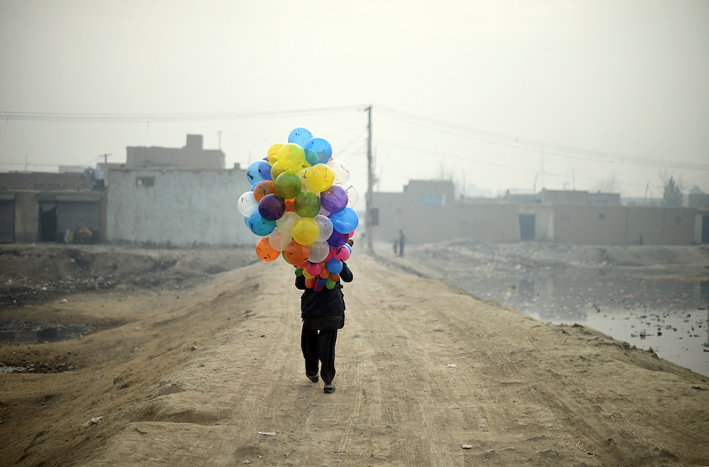 照片拍摄于2015年1月12日。19岁的气球小商贩 Arash 边走边寻找顾客。Arash 的气球5阿富汗尼一个,合人民币不到5毛钱。如果生意好的话,他每天能赚28块左右。虽说从2001年美国入侵阿富汗起,塔利班势力衰弱,阿富汗经济有明显增长,但世界银行的报告中显示,2011年仍有35.8%的人口低于阿富汗的贫困线,阿富汗也需要长期的国际资助来解决经济和低收入问题。