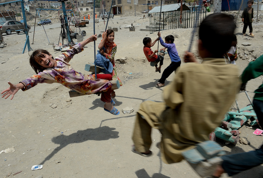 孩子在喀布尔一块墓地旁荡秋千。照片拍摄于2013年7月31日。