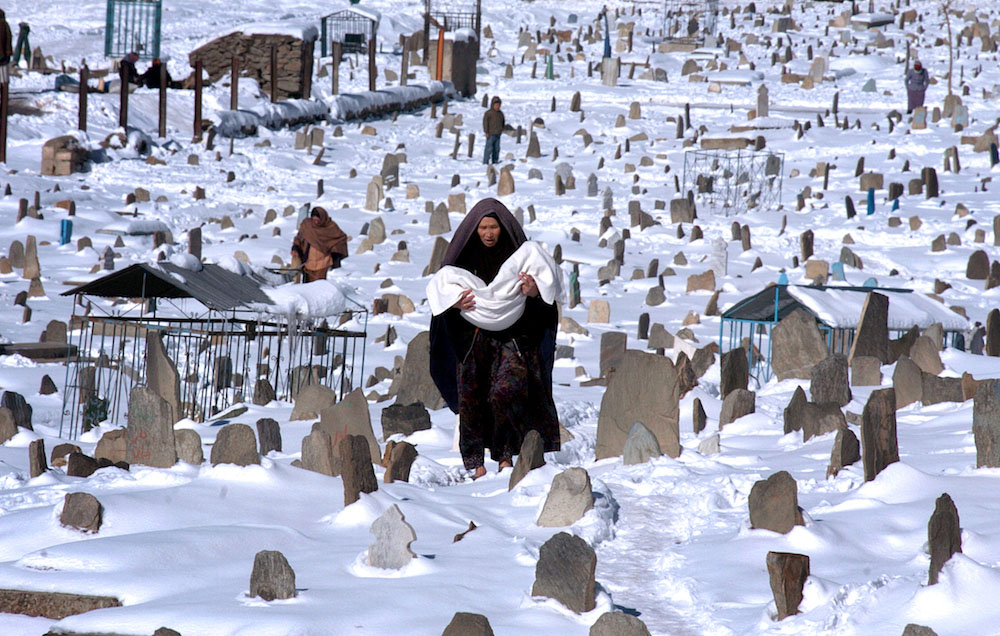 照片拍摄于2006年1月4日的喀布尔。一位妇女走过白雪覆盖的墓地。在冬天来临的时候,许多阿富汗人无法为自己的家人提供食物,也很难找到栖身之处。