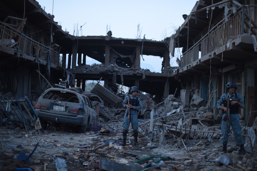 照片拍摄于2015年8月7日,喀布尔。当天,一辆装有炸弹的卡车炸毁了这处集市,导致至少7人死亡,过百人受伤。阿富汗警方在此地值守。这是继塔利班领导人穆罕穆德·奥马尔死亡后,塔利班对首都喀布尔的首次主要袭击。