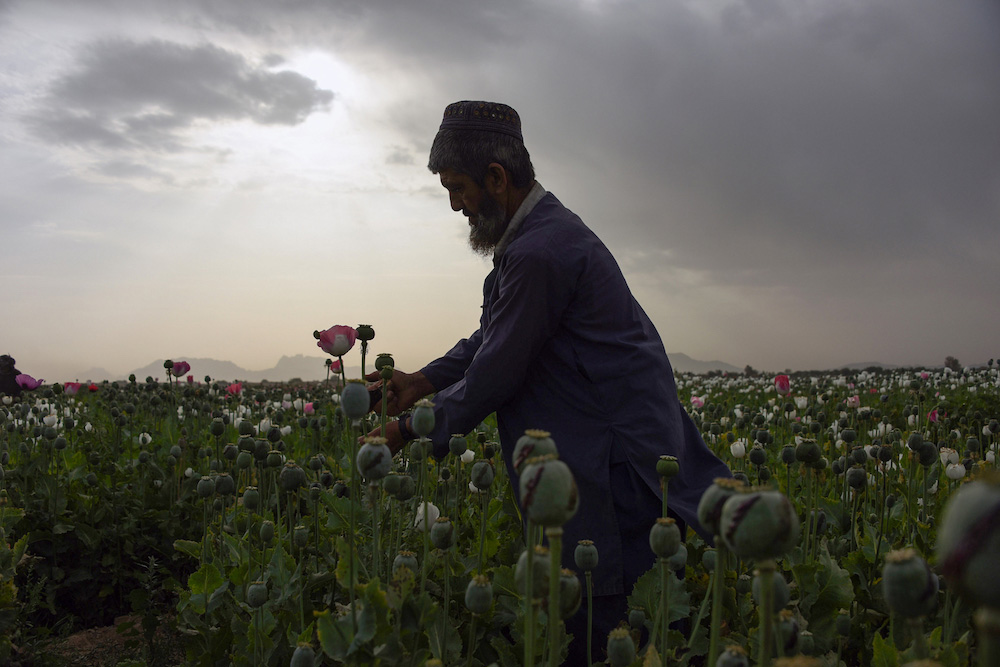 照片拍摄于2018年4月9日。一位阿富汗农民在罂粟田里收获鸦片汁。美国在战争中花了几十亿来阻止打击毒品生产,但阿富汗仍是全世界罂粟的主要生产地。