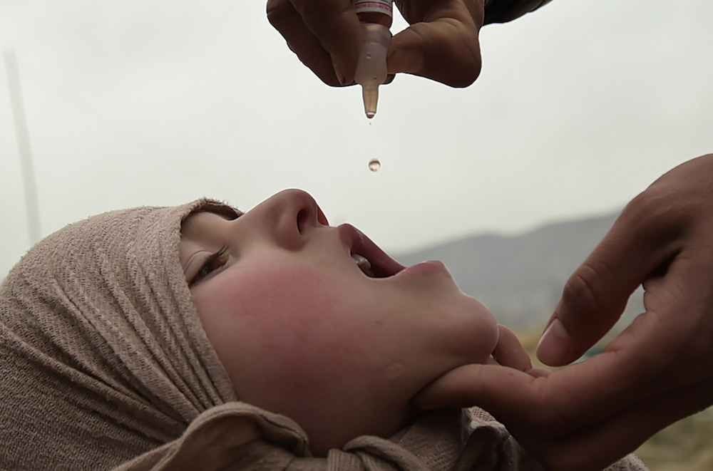 照片拍摄于2017年2月28日,喀布尔。公共卫生工作者给一名阿富汗儿童小儿麻痹疫苗。现在,小儿麻痹只有在阿富汗,尼日利亚和巴基斯坦仍没有得到普遍防预和治疗。