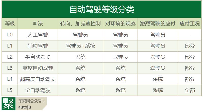 现在,权威机构已经对“智商”做了分级,即我们通常讲的L1~L5等级划分,每个等级对应不同智能程度的自动驾驶系统。