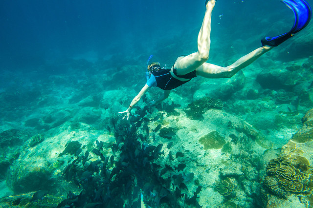 自由潜水是指不携带氧气瓶,尽可能深地潜入海中。比赛的胜负则由潜入的深度和停留时间来决定。在巴哈马长岛的Dean’s蓝洞是目前已知的世界第一深穴,深约202米。2010年4月,著名潜水员威廉·突鲁比利治曾在该蓝洞打破自由潜水世界纪录,游至92米深处;同年12月,他又仅凭自己的手和脚做动力,游至101米深处。除此之外,这里还有几乎没有污染纯净的海水,倘若你不敢潜那么深,在水中自在地漂一会也不是不行。