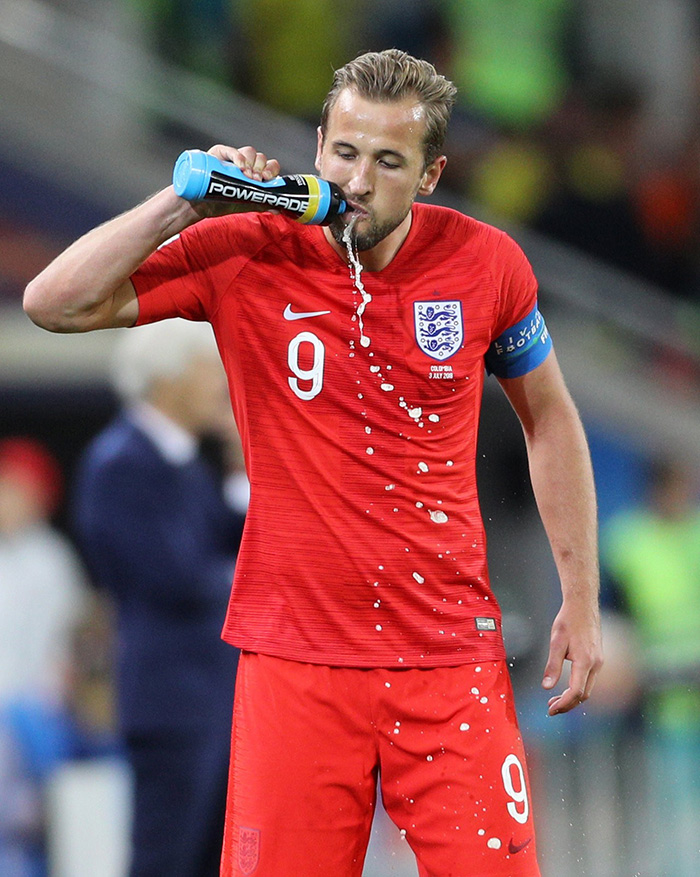 淘汰赛第二轮面对哥伦比亚的比赛中,比赛在30分钟的加时赛后依然未分胜负。点球大战开始前,凯恩拿起了自己的运动水杯补水。但他之后并没有把嘴里的液体喝下去,而是给吐了出来。