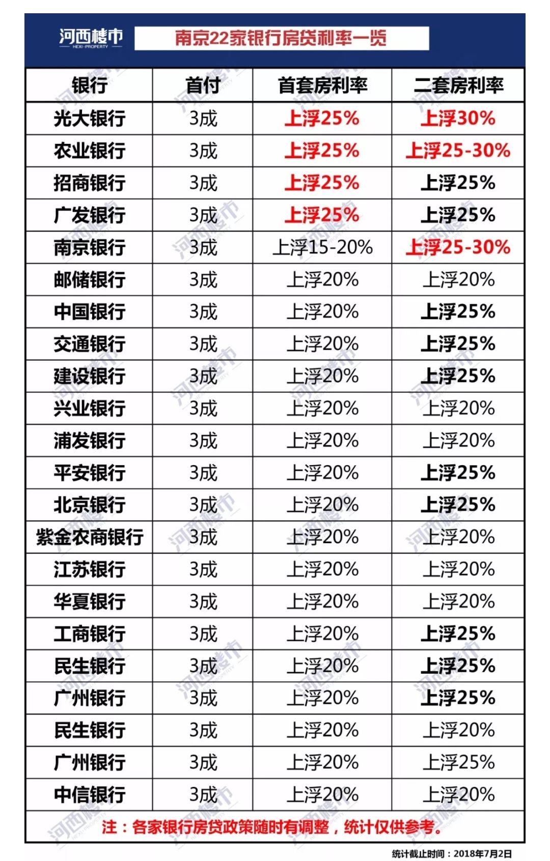同时,据问宅7月2日最新统计,南京22家主力银行首套房贷款利率中: