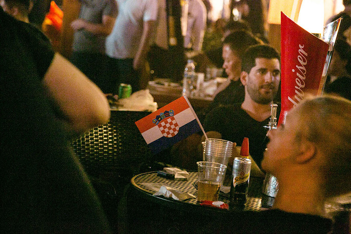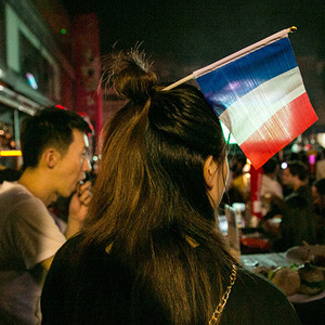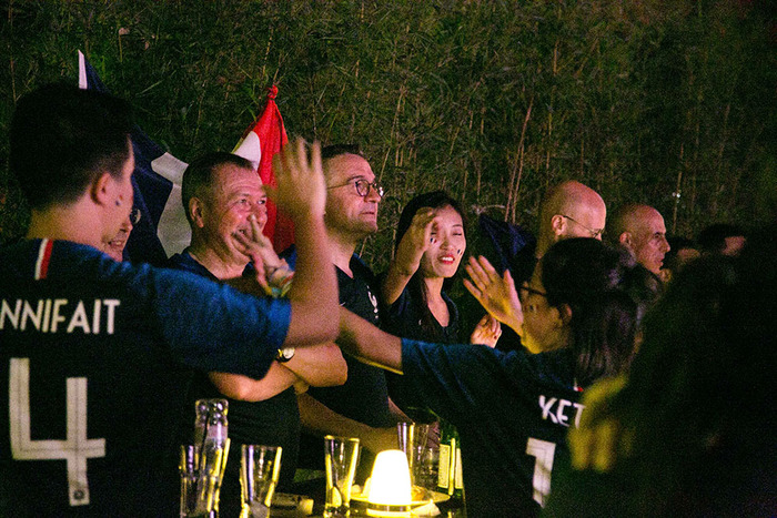 13. 晚上11点,比赛正式开始。在一家法国餐厅,法国球迷在奏国歌环节跟随电视一起高唱法国国歌,为本国球队加油。