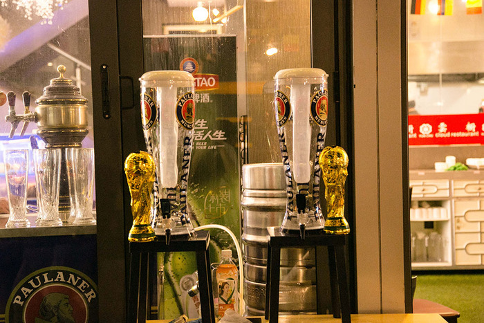 3. 一家餐厅门口放置着3升的空啤酒容器,和仿制的大力神杯。