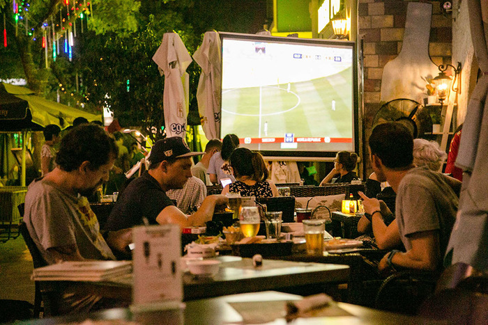 8. 没有坐上桌子的球迷们,索性在餐厅门口一处空地席地而坐,餐厅在高处挂上一个小型电视机,又是一处看球宝地。