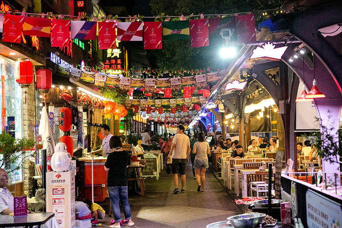 2. 老外街挂满入围参赛国的国旗,充满着浓郁的世界杯气氛。