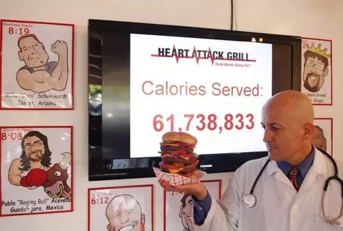 “心脏病烧烤餐厅”的菜谱包括以多种心脏手术命名的超肥腻快餐食品,其招牌菜是“心脏搭桥汉堡包”,根据食客要求,有一层到四层的选择,其分量从半磅至两磅牛肉不等。其中,四层的“心脏搭桥”汉堡包括了两磅的牛肉,厚厚的四层奶酪和 12 片熏肉,它所含的热量超过了8000卡路里。而另一道“高卡”杀手锏就要数猪油炸的“肥胖炸薯条”,以及全糖可乐、无滤嘴香烟、烈酒和啤酒等。
