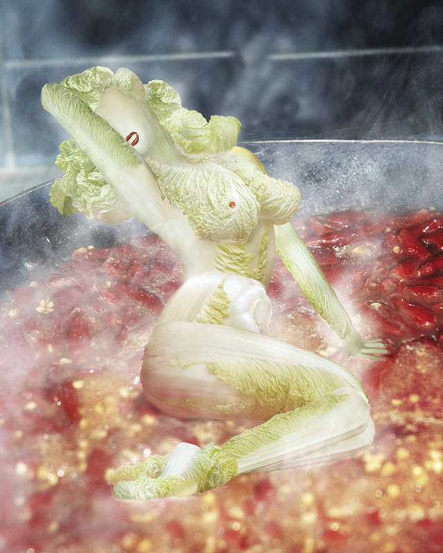 但白菜除了炖豆腐、做泡菜、下火锅以外,还可以变身“美女”。从又笨又粗的普通白菜蜕变为娇滴滴的美少女,孙悟空拔根毫毛吹口气可以达成、哈利波特施魔法念咒语也可以实现,文艺女子桔多淇就要费一番功夫了,但终究她将一棵棵白菜变成了一枚枚鲜亮的美女。桔多淇将她这组创作命名为《白菜的幻想》。