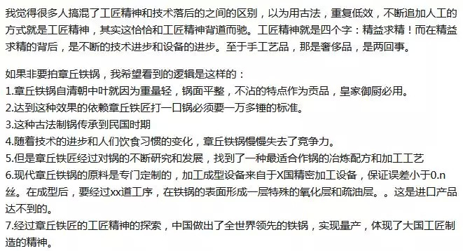 所以当复兴传统手工艺的情怀牌打了出来,产品质量却出了问题,还一味地向消费者贩卖艰辛,让消费者过多地为形而上的因素买单就成了坏。而且从商品的功能来看,铁锅作为一个家用物件,其实也远没有那么重大的责任需要挑起“工匠精神”这样一个大梁。