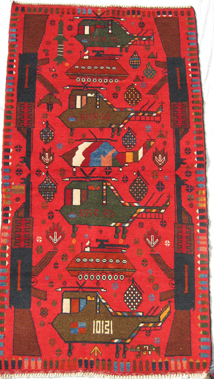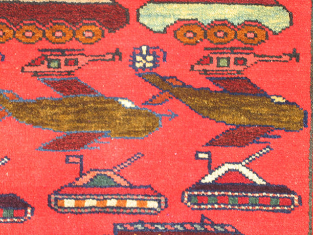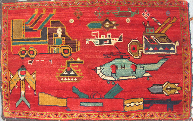 【19】土库曼红毯,绣有卡拉什尼科夫步枪、直升机和坦克(巴基斯坦)