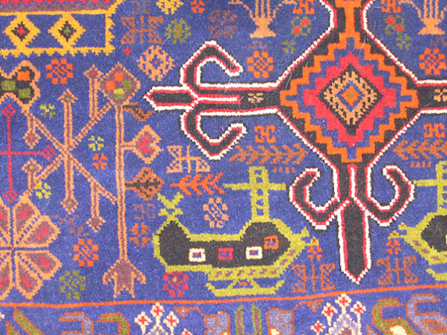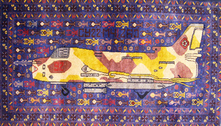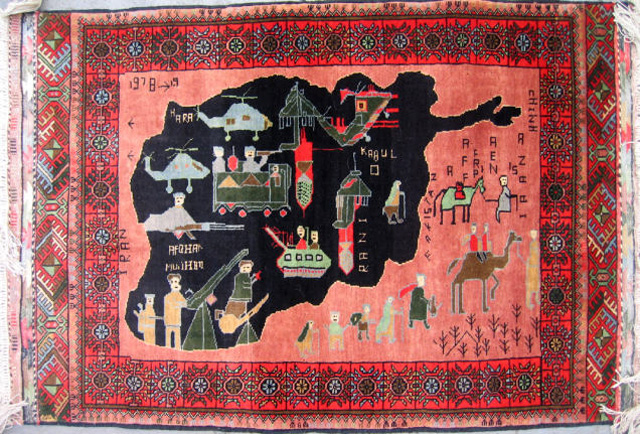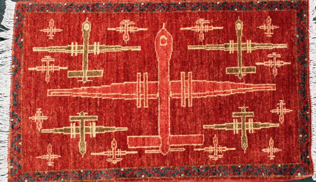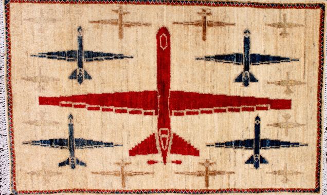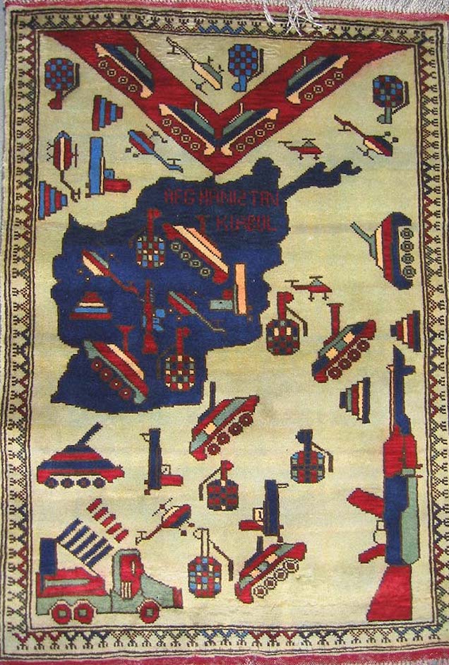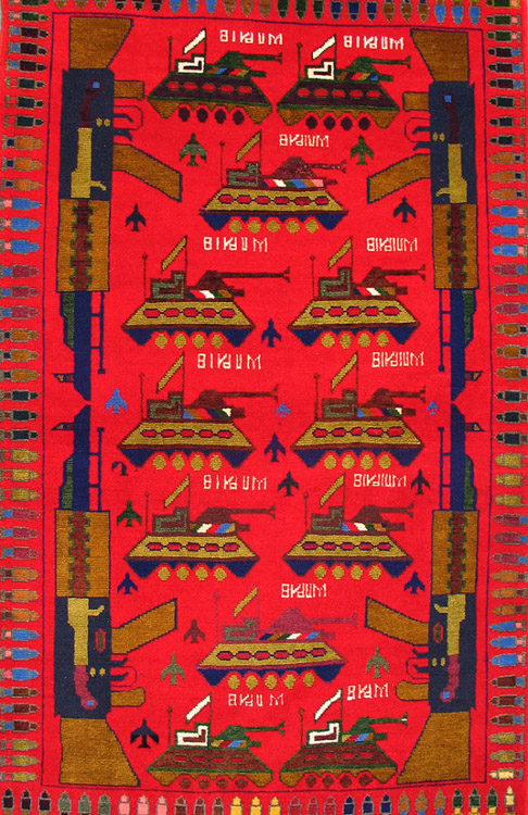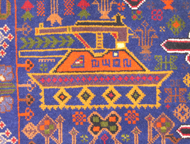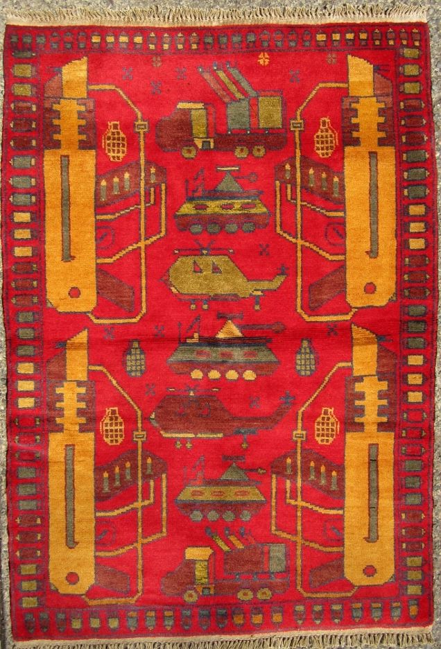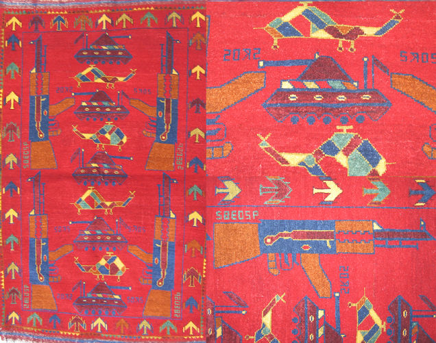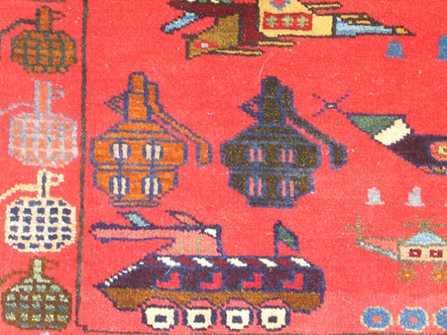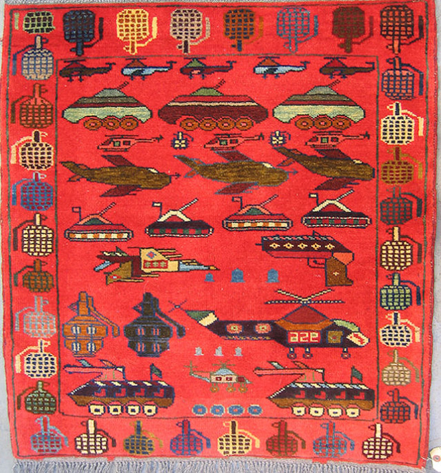 从1979年苏联入侵开始,阿富汗就一直笼罩在战争的阴影之中。为了与阿富汗纷飞的战火相呼应,当地部分织工会开始避免在地毯上使用花朵等图案,并将坦克、轰炸机等战争机器融入其中。之后,地毯图案逐渐成为了阿富汗民间舆论的一种标志。购物网站WarRug.com搜集了这些优秀作品,网站上约有上百块地毯可供购买。