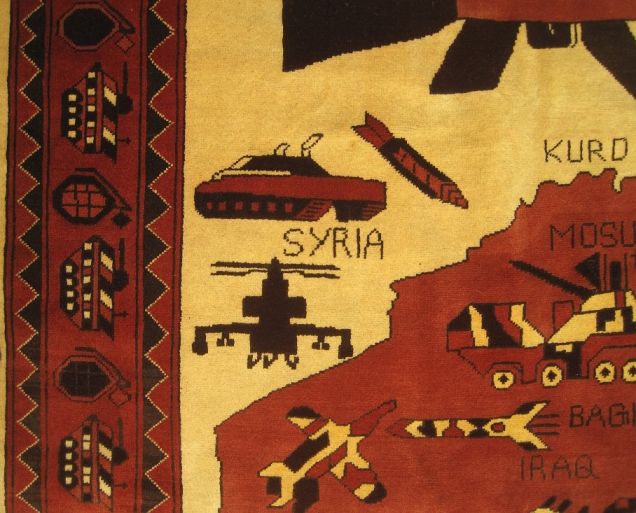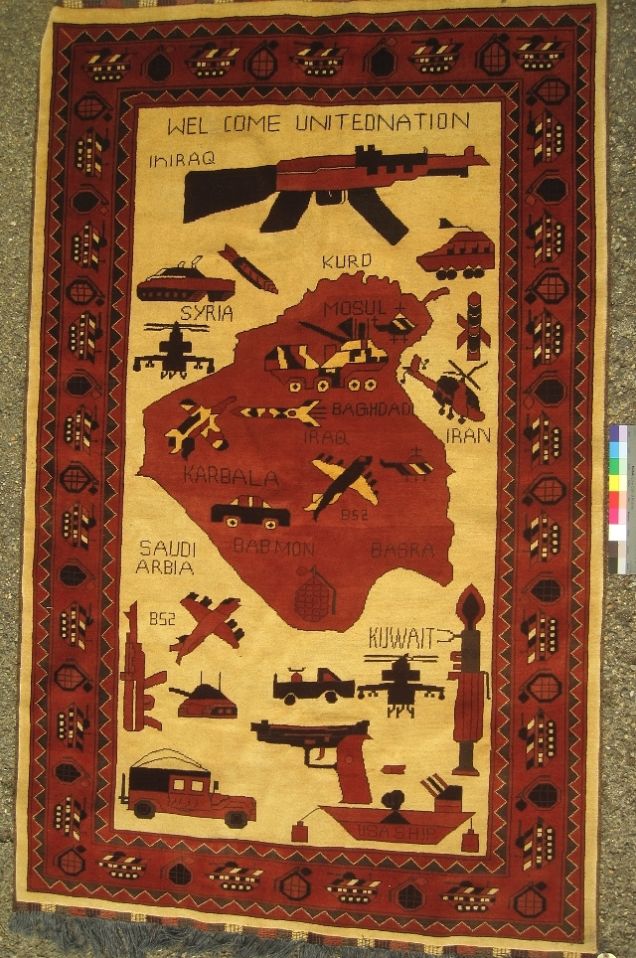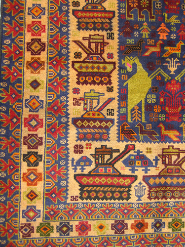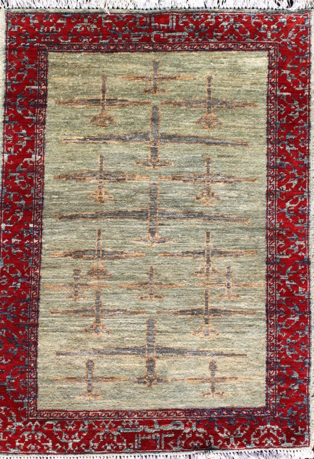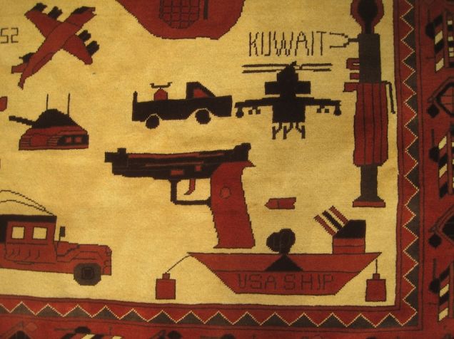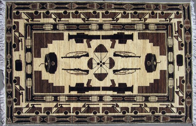 【21】土耳其羊毛毯,有地雷、杀伤炸弹、工程车、毒刺导弹与李-恩菲尔德.303口径步枪等图案装饰(巴基斯坦,2013)