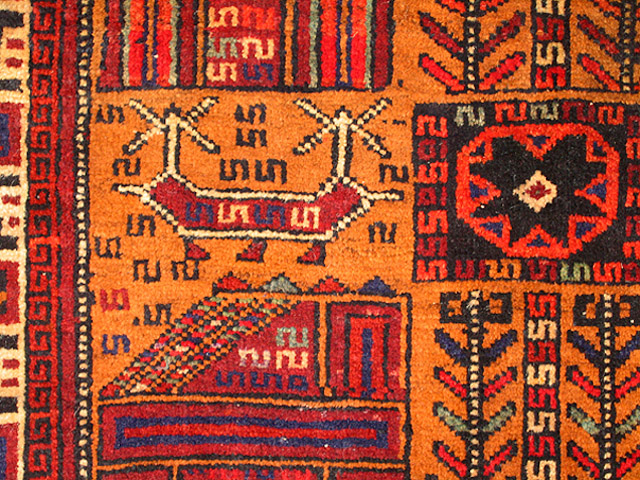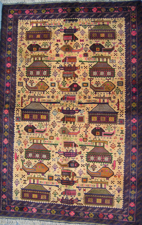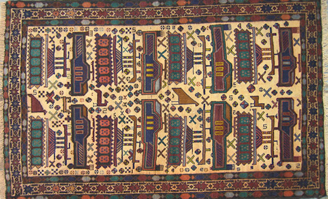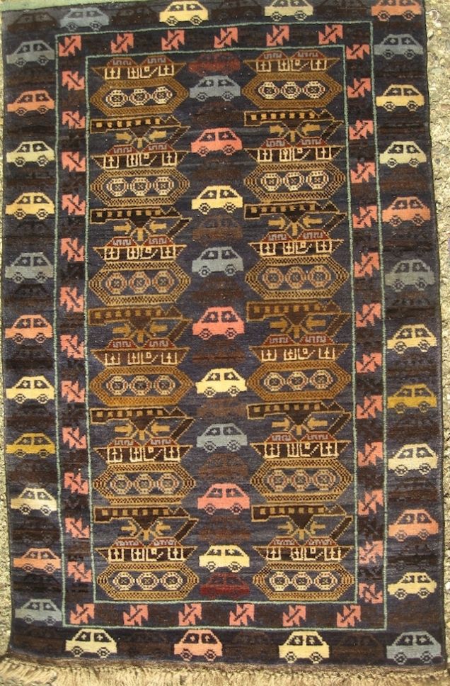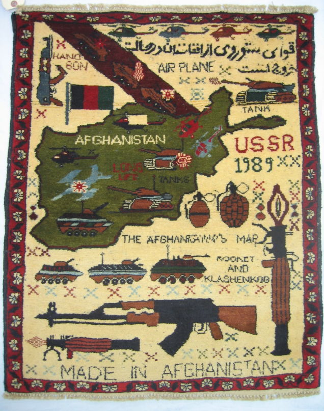 这些带有战争场景的地毯多由阿富汗人、俾路支人(Balochi)、土耳其人、乌兹别克人、土库曼人在阿富汗或是巴基斯坦制作。