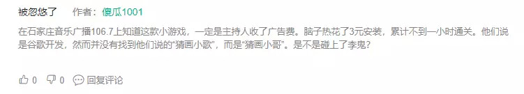 “小哥”的绝大部分玩家都是奔着谷歌的名气,在交纳了3块钱的入场券后,才发现货不对板:一位用户通过广播电台得知《猜画小歌》的存在,主持人力推《猜画小歌》,于是这位用户下载了《猜画小哥》。在体验过游戏后,该用户深深地怀疑主持人收了广告费......