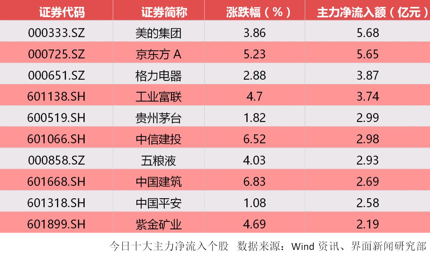 个股表现上看,沪深两市共有36只个股主力净流入额超过1亿元,“中字头”个股表现突出。除去未开板新股,美的集团(000333.SZ)、京东方A(000725.SZ)、格力电器(000651.SZ)吸引主力资金净流入居前,分别获5.68亿元、5.65亿元、3.87亿元主力资金流入。
