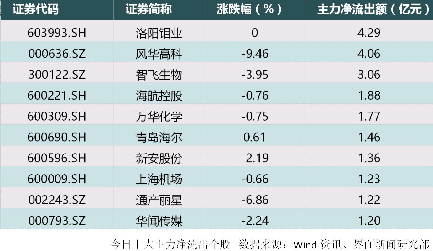 沪深两市共计12只个股主力资金净流出额超1亿元。洛阳钼业(603993.SH)、风华高科(000636.SZ)、智飞生物(300122.SZ)分别遭4.29亿元、4.06亿元、3.06亿元主力资金流出忝列前位;长生生物(002680.SZ)、康泰生物(300601.SZ)钉牢跌停。
