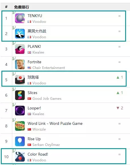而今日,Voodoo又一款休闲小游戏《TENKYU》登顶iOS美国游戏免费榜,居于《Hole.io》之上。但这款产品并非Voodoo新作,《TENKYU》自2017年年初上线以来,甚至从未进入免费榜TOP1000以内,但是却被Voodoo救活了。至今Voodoo已经有太多成功的案例,这一套发行打法到底为什么屡试不爽?