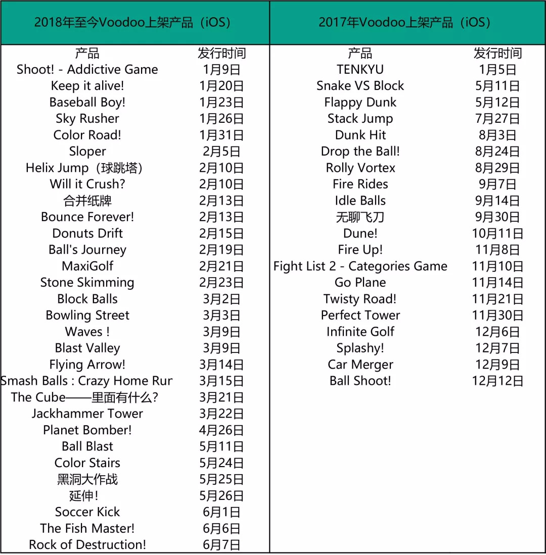 App Annie数据显示,2017年上半年Voodoo仅发布了TENKYU、Snake VS Block以及Flappy Dunk三款手游产品,之后Voodoo以快节奏上线了17款休闲游戏,以每10天一款产品的频率推向市场,其中《Snake VS Block》、《Dune!》等多款产品均拿下过美国iOS游戏免费榜TOP1。