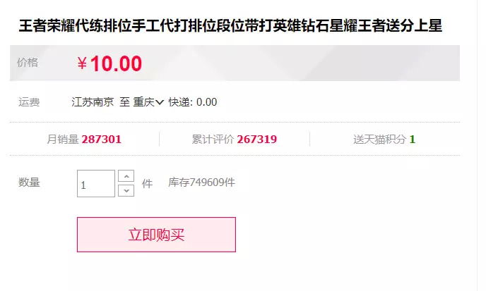 端游市场的疲软,同样导致了端游代练的疲软,可以说大量的端游代练可获取利益基本上已经是固定的了。直到《王者荣耀》在国内的大热,大量代练工作室看到了手游上的新商机,抓住这个机会大赚了一笔。2017年2月,就淘宝天猫的《王者荣耀》代练商家数据直观而言,当时的日发单量接近2万,金额达到了至少200万,且还在持续上涨。截止到2018年6月,排名第一的《王者荣耀》代练淘宝店,月销量依旧超过28万。