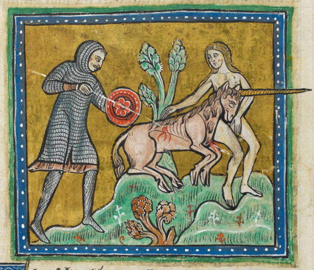 上图是中世纪流行书籍上的特色插画之一,经常出现在动物寓言集或是百科全书中,亦真亦幻。不只包含动物自然史,也会与圣经里的人物相对应。独角兽代表基督,因为他曾被抓捕并处死,就像独角兽死在处女的怀抱(尽管也有其他动物代表基督,就连鹈鹕也是,据说这种鸟类会啄破自己的乳房,以血哺育下一代,就像基督为我们流下自己的鲜血。)