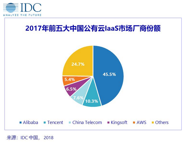 知名咨询机构国际数据公司(IDC)最近发布的《中国公有云服务市场半年度跟踪报告》显示,在2017年中国公有云IaaS市场上,阿里云继续保持领军位置,份额达45.5%;腾讯云第二,份额突破10%;中国电信排名第三,同比增长约51%;位居第四的金山云,实现同比增长82%;亚马逊AWS增长迅速,首次进入IaaS市场前五。