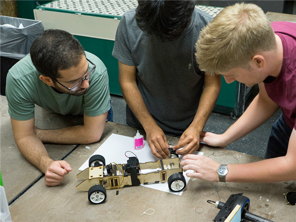 他们第一个遥控车原型用的是一种刚硬却易碎、像石膏一样的材料制成。虽然在预赛中表现不错,但却跑不远。“橡皮筋充分旋转扭动的时候会产生巨大的扭力,这些扭力会施加在结构上,整辆车就成了定时炸弹。因为任何小的裂缝最终都可能导致整辆车散架。”