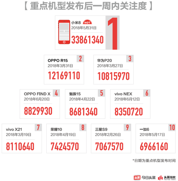 各家手机品牌发布的主要机型用户关注和阅读数据(新机型发布一周内),也同样说明了这一点。
