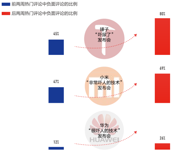 从2018上半年来看,锤子发布会可谓是“灾难性”的案例,前期用户负面评论达45%,后期更是高达80%。无论是产品销售还是企业品牌角度,从用户评论的几乎“一边倒”来看,用户没“吓尿”,而罗老师确实“玩砸”了。