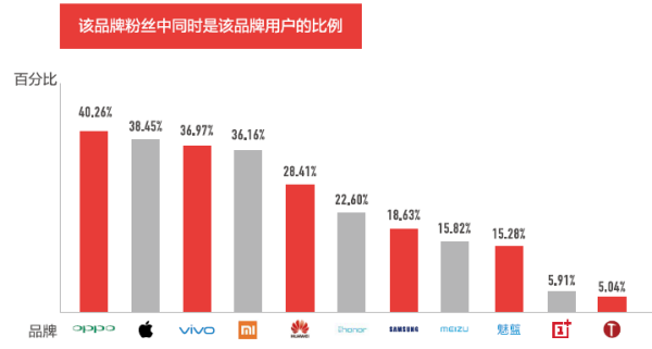 从数据来看,跨手机品牌粉丝重合度超过50%的有:三星(52%)→华为,魅蓝(51%)/魅族(50%)→华为,魅蓝(66%)/魅族(63%)→小米,锤子(50%)→小米,一加(76%)→小米,一加(69%)→华为,一加(60%)→魅族。
