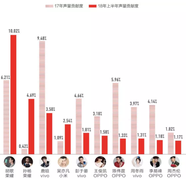 头条指数公布的数据显示,2018年给手机企业带来“声量贡献度”(代言人和手机品牌同时出现的相关资讯阅读量)前五位的明星代言人,分别是:胡歌(荣耀)、孙扬(荣耀)、鹿晗(vivo)、吴亦凡(小米)、彭于晏(vivo)。与2017全年公布的数值对比,可以看到以下变化
