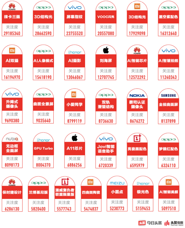 头条指数公布的数据显示,2018上半年有31个手机功能卖点的用户关注度超过了500万,相比2017年从数量和创新点上来看都明显提升。