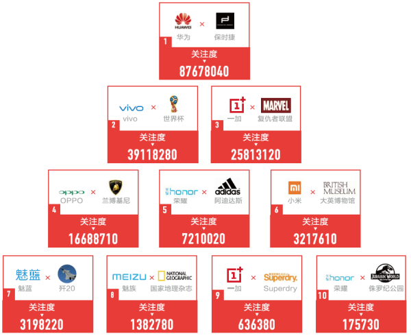 从数据来看,用户关注度超过千万的“爆款”跨界合作有四个,分别为: 华为—保时捷、vivo—FiFA 世界杯、一加—漫威《复仇者联盟》、OPPO—兰博基尼。其中华为—保时捷的跨界合作始于2016年的Mate 9,至今已历经两年和四代产品,成为中国手机企业品牌跨界合作的经典案例。2018上半年今日头条的用户关注度超过8767万,几乎相当于之后四名的用户关注度之和,表明其品牌跨界合作已影响到非常大的用户基数,对整个华为手机的品牌渗透率和口碑提升都带来了很好的推动作用。