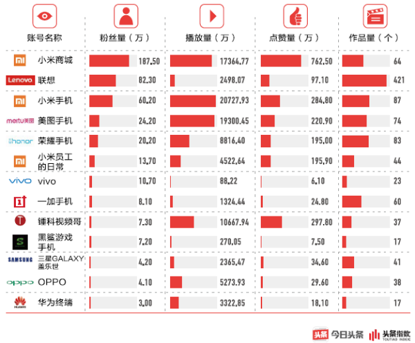 头条指数列举的主要手机品牌的用户阅读数据显示: