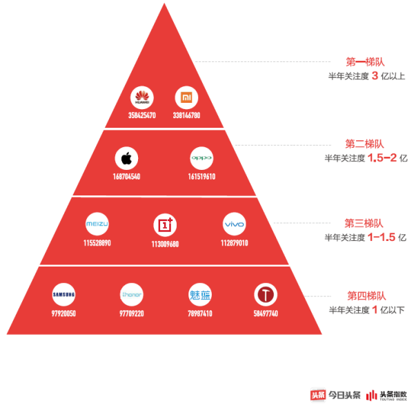 从头条指数公布的用户阅读数据来看,也同样呈现了这一趋势:华为、小米稳居第一梯队,半年用户关注度接超过3亿,苹果和OPPO位居第二梯队,在1.6亿左右;魅族、一加、vivo第三梯队,关注度约1.1亿;三星、荣耀、魅蓝、锤子位居第四梯队,关注度在1亿以下。