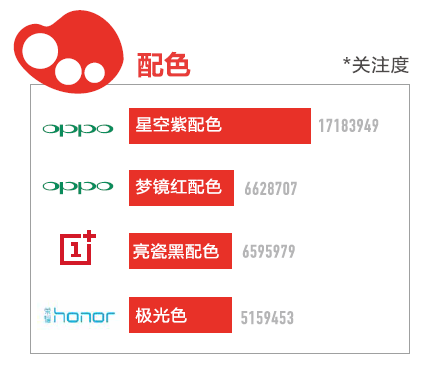 另一个比较有趣的现象是用户对手机“颜值”的关注度明显提升,OPPO成为“最色”的手机企业,其“星空紫配色”的用户关注度,甚至超过了其“梦镜红”、一加“亮瓷黑”和荣耀“极光色”的总和。