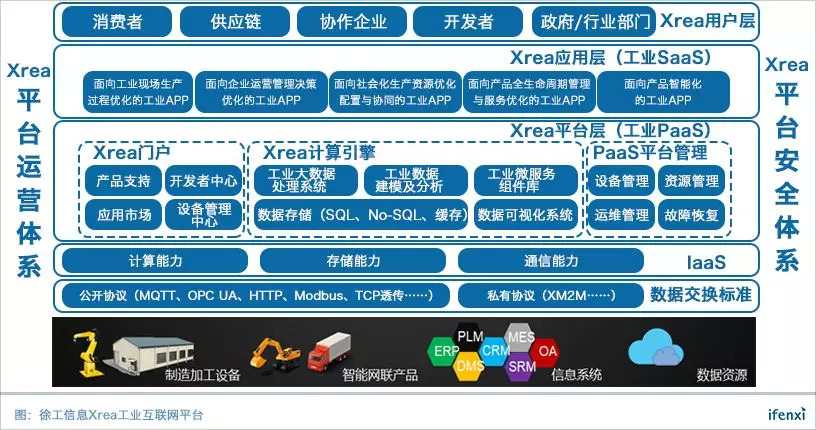 Xrea工业互联网平台共分为三层,IaaS部分将计算资源、存储资源、通信资源转为池化能力,为各类软件的运行提供支撑;PaaS层负责对数据存储、挖掘分析以及可视化,并且提供设备检测、异常预警等微服务;SaaS层负责提供针对不同行业不同需求的工业应用软件,例如预测性维护、共享租赁、物联网金融中的风险控制、征信评价等。