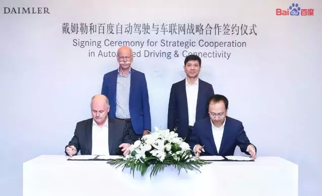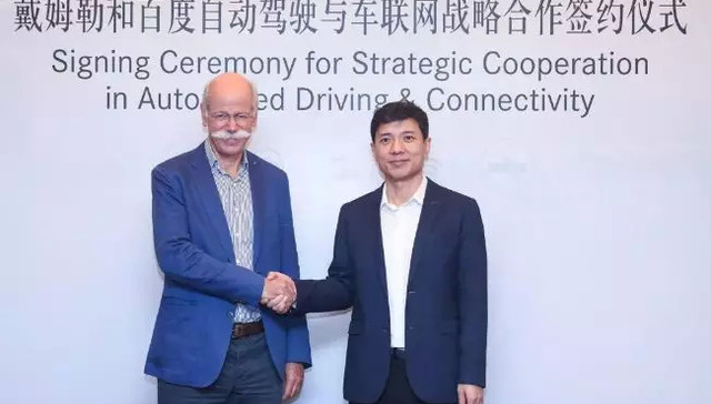 7月25日,戴姆勒股份公司董事会主席、梅赛德斯-奔驰汽车集团全球总裁蔡澈博士和百度创始人、董事长兼首席执行官李彦宏站在一起,共同见证了戴姆勒与百度深化自动驾驶和车联网领域战略合作的签约仪式。这并非两家企业间的首次合作,但两位领导的共同出席足以说明双方对于本次携手发展的重视程度。