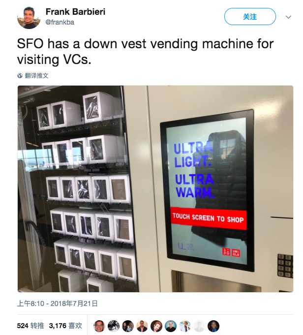 无论如何,这个旧金山机场的自动贩卖机帮优衣库赚了不少关注度。或许未来他们在硅谷设立一个给程序员的polo衫与格纹衬衫自动贩卖机,也能再火一把。