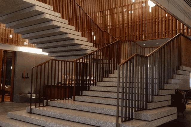位于大堂最显眼位置的这个旋转楼梯我也超级喜欢。水磨石台阶是一层层堆叠上去的、黄铜栅栏宛若巨型鸟笼、点缀着球型与长方形的灯具,很现代很震撼,是自拍首选地,也是魔都新晋网红打卡地标。